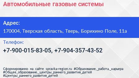 Автомобильные газовые системы по адресу 170004, Тверская область, Тверь, Борихино Поле, 11а в дальнейшем Организация, размещена в следующих категориях: