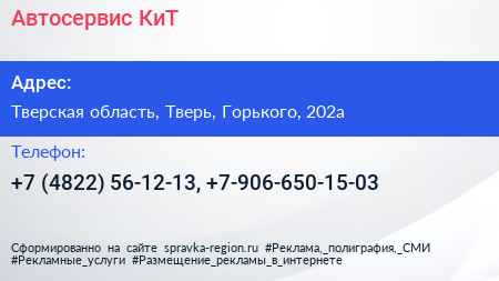 Автосервис КиТ по адресу Тверская область, Тверь, Горького, 202а в дальнейшем Организация, размещена в следующих категориях: