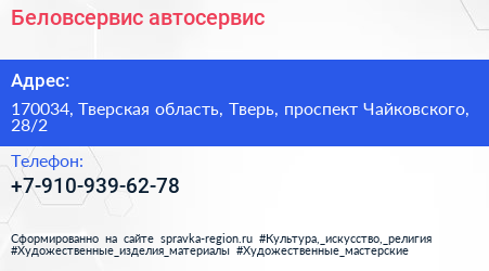Беловсервис, автосервис по адресу 170034, Тверская область, Тверь, проспект Чайковского, 28/2 в дальнейшем Организация, размещена в следующих категориях: