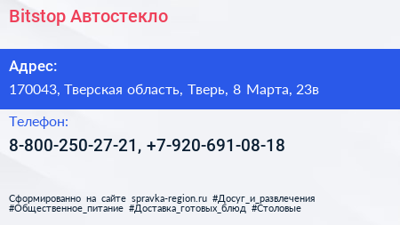 Bitstop Автостекло по адресу 170043, Тверская область, Тверь, 8 Марта, 23в в дальнейшем Организация, размещена в следующих категориях: