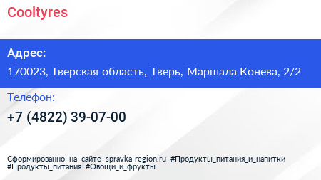 Cooltyres по адресу 170023, Тверская область, Тверь, Маршала Конева, 2/2 в дальнейшем Организация, размещена в следующих категориях: