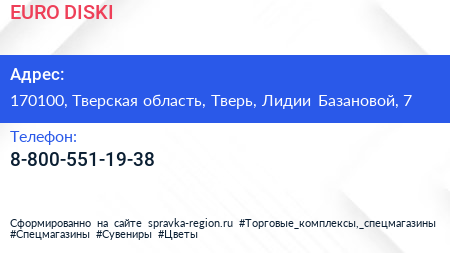 EURO-DISKI по адресу 170100, Тверская область, Тверь, Лидии Базановой, 7 в дальнейшем Организация, размещена в следующих категориях:
