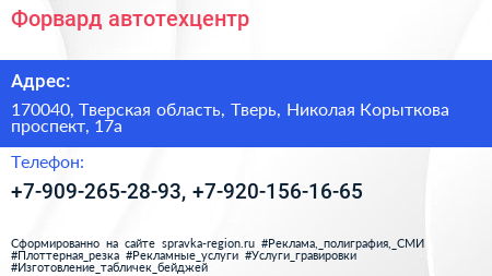 Форвард, автотехцентр по адресу 170040, Тверская область, Тверь, Николая Корыткова проспект, 17а в дальнейшем Организация, размещена в следующих категориях: