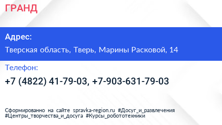 ГРАНД по адресу Тверская область, Тверь, Марины Расковой, 14 в дальнейшем Организация, размещена в следующих категориях: