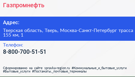 Газпромнефть по адресу Тверская область, Тверь, Москва-Санкт-Петербург трасса 155 км, 1 в дальнейшем Организация, размещена в следующих категориях: