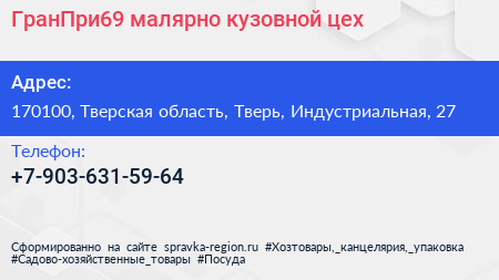 ГранПри69, малярно-кузовной цех по адресу 170100, Тверская область, Тверь, Индустриальная, 27 в дальнейшем Организация, размещена в следующих категориях: