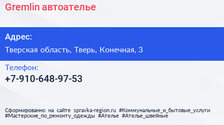 Gremlin, автоателье по адресу Тверская область, Тверь, Конечная, 3 в дальнейшем Организация, размещена в следующих категориях: