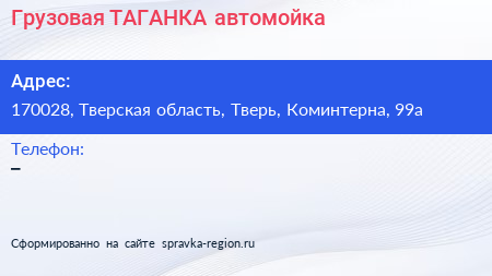 Грузовая ТАГАНКА, автомойка по адресу 170028, Тверская область, Тверь, Коминтерна, 99а в дальнейшем Организация, размещена в следующих категориях: