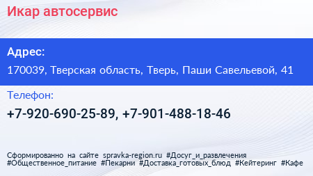 Икар, автосервис по адресу 170039, Тверская область, Тверь, Паши Савельевой, 41 в дальнейшем Организация, размещена в следующих категориях:
