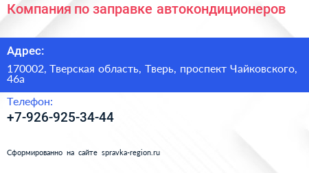 Компания по заправке автокондиционеров по адресу 170002, Тверская область, Тверь, проспект Чайковского, 46а в дальнейшем Организация, размещена в следующих категориях: