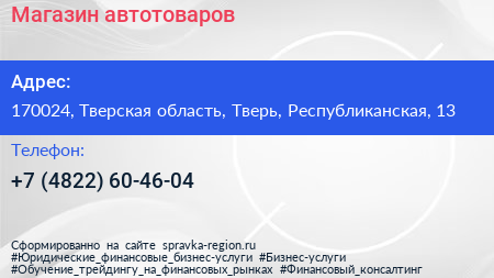 Магазин автотоваров по адресу 170024, Тверская область, Тверь, Республиканская, 13 в дальнейшем Организация, размещена в следующих категориях: