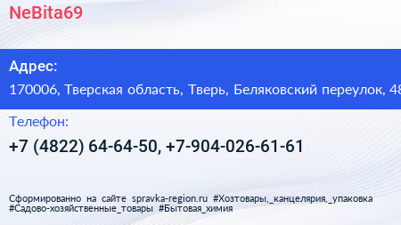NeBita69 по адресу 170006, Тверская область, Тверь, Беляковский переулок, 48 в дальнейшем Организация, размещена в следующих категориях: