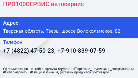 ПРО100СЕРВИС, автосервис по адресу Тверская область, Тверь, шоссе Волоколамское, 82 в дальнейшем Организация, размещена в следующих категориях:
