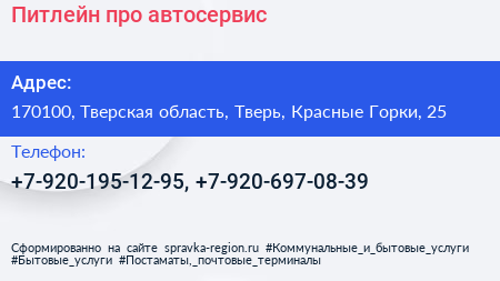 Питлейн.про, автосервис по адресу 170100, Тверская область, Тверь, Красные Горки, 25 в дальнейшем Организация, размещена в следующих категориях: