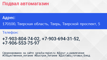 Подвал, автомагазин по адресу 170100, Тверская область, Тверь, Тверской проспект, 5 в дальнейшем Организация, размещена в следующих категориях: