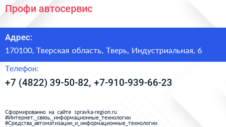 Профи, автосервис по адресу 170100, Тверская область, Тверь, Индустриальная, 6 в дальнейшем Организация, размещена в следующих категориях: