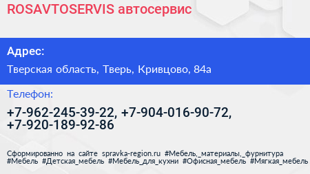 ROSAVTOSERVIS, автосервис по адресу Тверская область, Тверь, Кривцово, 84а в дальнейшем Организация, размещена в следующих категориях: