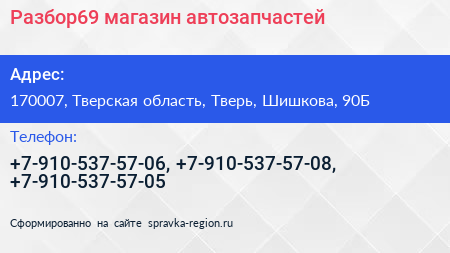 Разбор69, магазин автозапчастей по адресу 170007, Тверская область, Тверь, Шишкова, 90Б в дальнейшем Организация, размещена в следующих категориях: