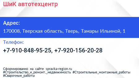 ШиК, автотехцентр по адресу 170008, Тверская область, Тверь, Тамары Ильиной, 1 в дальнейшем Организация, размещена в следующих категориях: