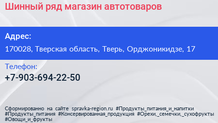 Шинный ряд, магазин автотоваров по адресу 170028, Тверская область, Тверь, Орджоникидзе, 17 в дальнейшем Организация, размещена в следующих категориях: