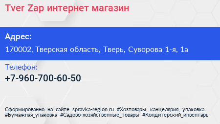 Tver-Zap, интернет-магазин по адресу 170002, Тверская область, Тверь, Суворова 1-я, 1а в дальнейшем Организация, размещена в следующих категориях: