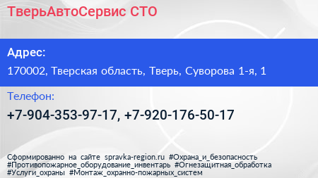 ТверьАвтоСервис, СТО по адресу 170002, Тверская область, Тверь, Суворова 1-я, 1 в дальнейшем Организация, размещена в следующих категориях: