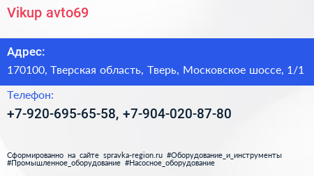 Vikup-avto69 по адресу 170100, Тверская область, Тверь, Московское шоссе, 1/1 в дальнейшем Организация, размещена в следующих категориях: