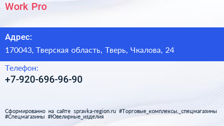 Work Pro по адресу 170043, Тверская область, Тверь, Чкалова, 24 в дальнейшем Организация, размещена в следующих категориях: