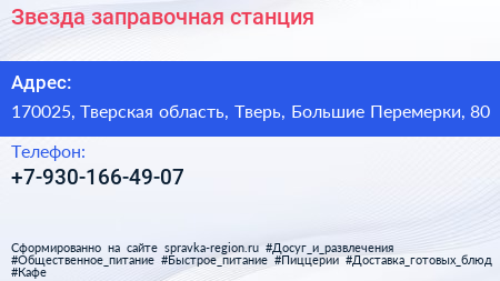 Звезда, заправочная станция по адресу 170025, Тверская область, Тверь, Большие Перемерки, 80 в дальнейшем Организация, размещена в следующих категориях: