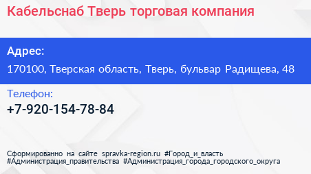 Кабельснаб-Тверь, торговая компания по адресу 170100, Тверская область, Тверь, бульвар Радищева, 48 в дальнейшем Организация, размещена в следующих категориях:
