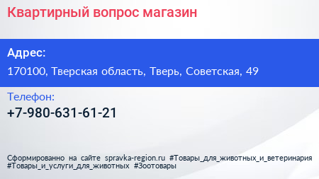 Квартирный вопрос, магазин по адресу 170100, Тверская область, Тверь, Советская, 49 в дальнейшем Организация, размещена в следующих категориях: