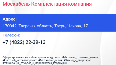 Москабель-Комплектация, компания по адресу 170042, Тверская область, Тверь, Чехова, 17 в дальнейшем Организация, размещена в следующих категориях: