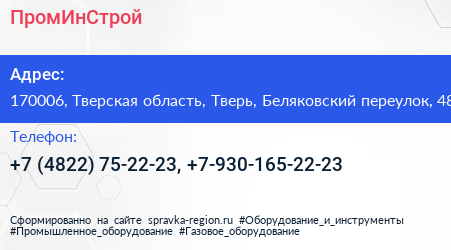 ПромИнСтрой по адресу 170006, Тверская область, Тверь, Беляковский переулок, 48 в дальнейшем Организация, размещена в следующих категориях: