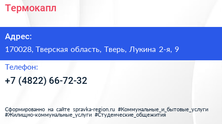 Термокапл по адресу 170028, Тверская область, Тверь, Лукина 2-я, 9 в дальнейшем Организация, размещена в следующих категориях: