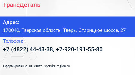 ТрансДеталь по адресу 170040, Тверская область, Тверь, Старицкое шоссе, 27 в дальнейшем Организация, размещена в следующих категориях: