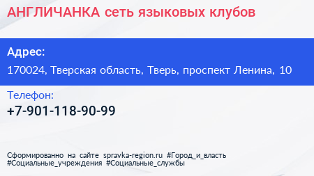 АНГЛИЧАНКА, сеть языковых клубов по адресу 170024, Тверская область, Тверь, проспект Ленина, 10 в дальнейшем Организация, размещена в следующих категориях: