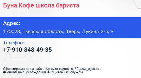 Буна Кофе, школа бариста по адресу 170028, Тверская область, Тверь, Лукина 2-я, 9 в дальнейшем Организация, размещена в следующих категориях: