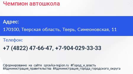 Чемпион, автошкола по адресу 170100, Тверская область, Тверь, Симеоновская, 11 в дальнейшем Организация, размещена в следующих категориях: