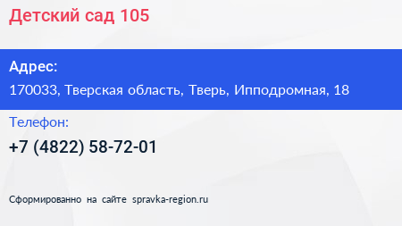 Детский сад №105 по адресу 170033, Тверская область, Тверь, Ипподромная, 18 в дальнейшем Организация, размещена в следующих категориях: