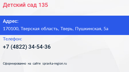 Детский сад №135 по адресу 170100, Тверская область, Тверь, Пушкинская, 5а в дальнейшем Организация, размещена в следующих категориях: