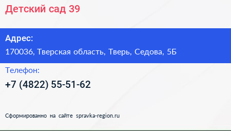Детский сад №39 по адресу 170036, Тверская область, Тверь, Седова, 5Б в дальнейшем Организация, размещена в следующих категориях: