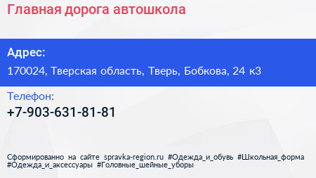 Главная дорога, автошкола по адресу 170024, Тверская область, Тверь, Бобкова, 24 к3 в дальнейшем Организация, размещена в следующих категориях: