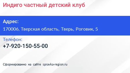 Индиго, частный детский клуб по адресу 170006, Тверская область, Тверь, Роговик, 5 в дальнейшем Организация, размещена в следующих категориях: