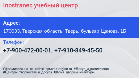 Inostranec, учебный центр по адресу 170033, Тверская область, Тверь, бульвар Цанова, 1Б в дальнейшем Организация, размещена в следующих категориях: