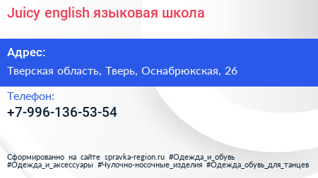 Juicy english, языковая школа по адресу Тверская область, Тверь, Оснабрюкская, 26 в дальнейшем Организация, размещена в следующих категориях:
