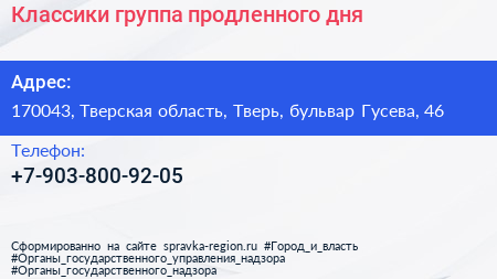 Классики, группа продленного дня по адресу 170043, Тверская область, Тверь, бульвар Гусева, 46 в дальнейшем Организация, размещена в следующих категориях: