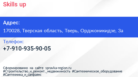 Skills up по адресу 170028, Тверская область, Тверь, Орджоникидзе, 3а в дальнейшем Организация, размещена в следующих категориях: