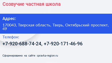 Созвучие, частная школа по адресу 170043, Тверская область, Тверь, Октябрьский проспект, 49 в дальнейшем Организация, размещена в следующих категориях: