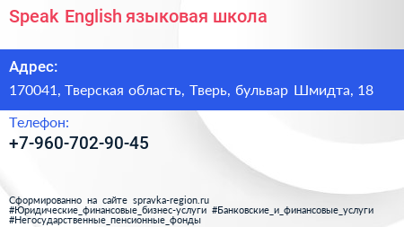 Speak English, языковая школа по адресу 170041, Тверская область, Тверь, бульвар Шмидта, 18 в дальнейшем Организация, размещена в следующих категориях: