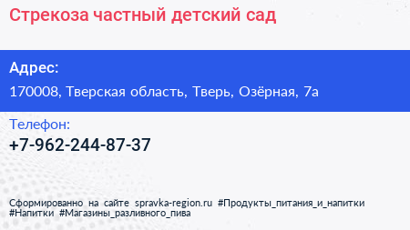 Стрекоза, частный детский сад по адресу 170008, Тверская область, Тверь, Озёрная, 7а в дальнейшем Организация, размещена в следующих категориях: